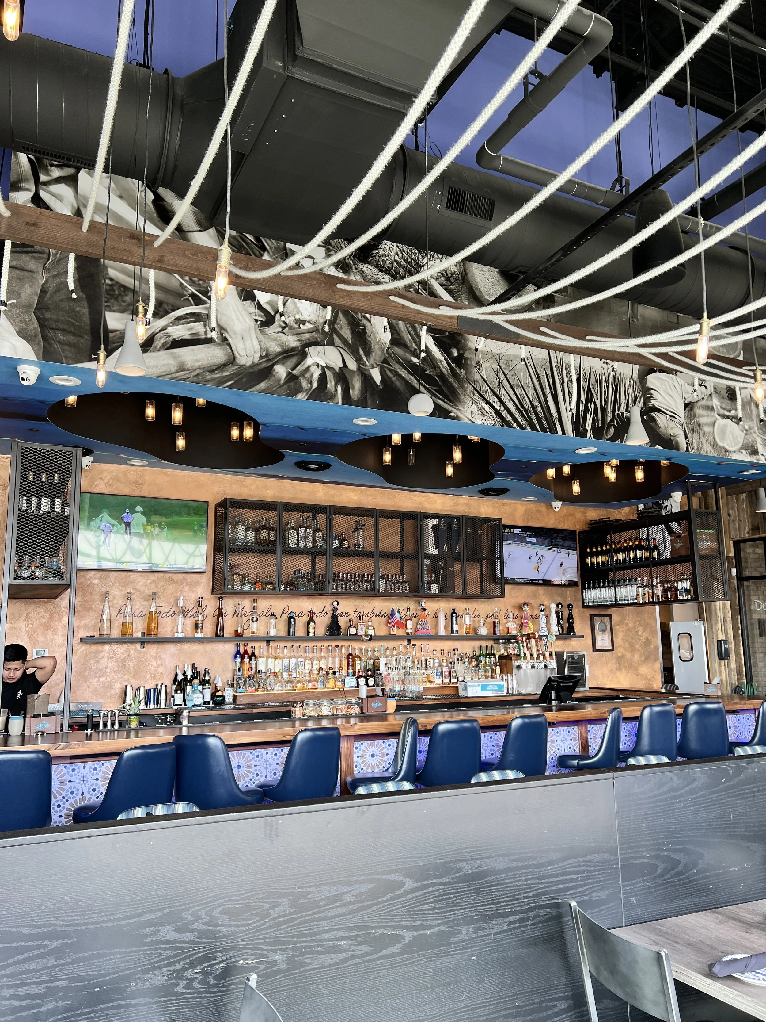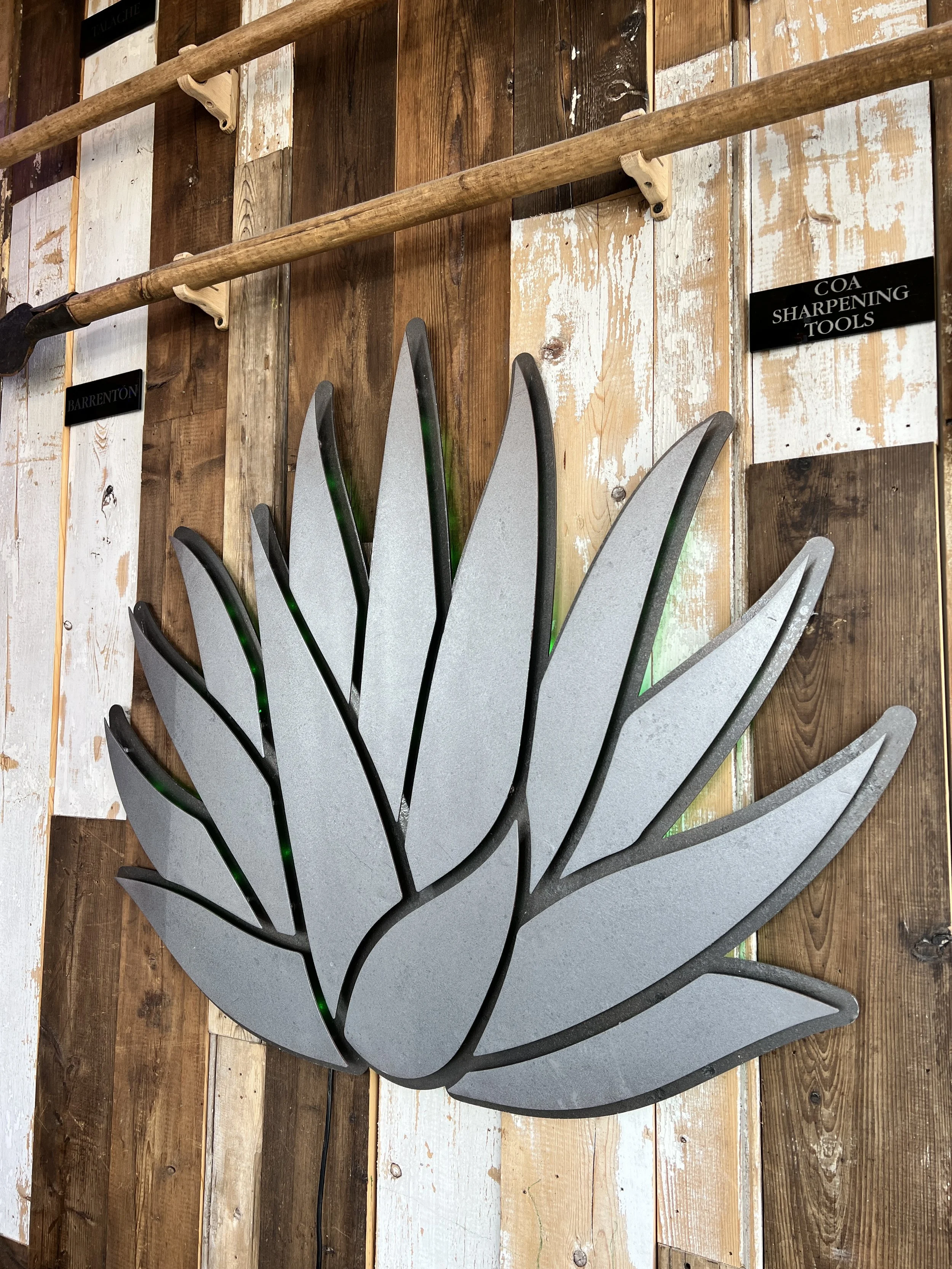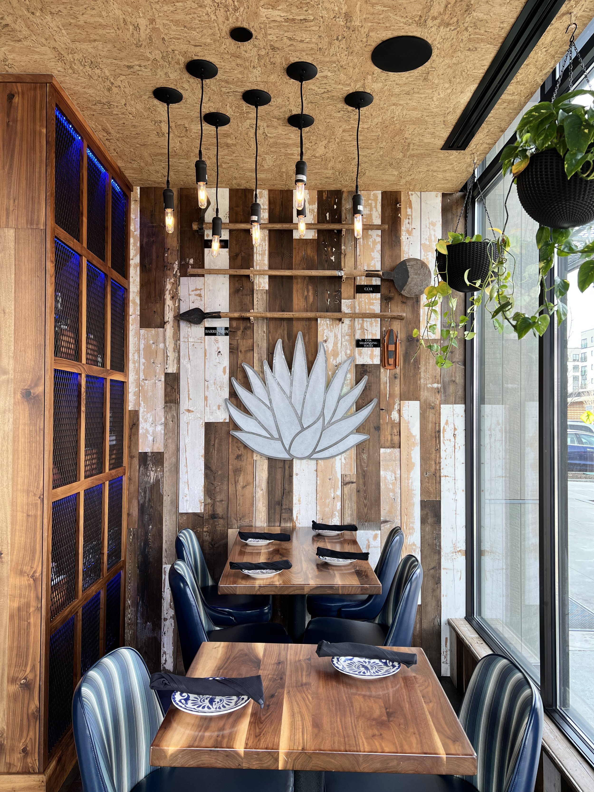The space comes alive through a layered, immersive art program that celebrates Mexican culture with a modern edge. Hand-painted wall murals wrap the interior in bold color, organic movement, and storytelling motifs that set the tone from the moment you walk in. Complementing the murals, custom greenery artwork introduces a fresh, botanical rhythm—lush hues and natural forms that echo the spirit of agave and the landscapes it comes from. Anchoring the feature wall, a custom metal agave sign glows with soft illumination, creating a striking focal point that feels both sculptural and iconic. Above it, a curated arrangement of authentic agave harvesting tools adds depth and heritage, bridging craftsmanship of the past with a contemporary hospitality experience.